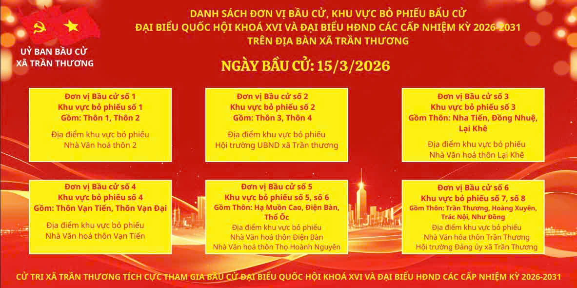 • Đơn vị Bầu cử số 6. Khu vực bỏ phiếu số 7, số 8 gồm Thôn: Trần Thương, Hoàng Xuyên, Trác Nội, Như Đồng. Địa điểm khu vực bỏ phiếu Nhà Văn hóa thôn Trần Thương; Hội trường Đảng ủy xã Trần Thương.